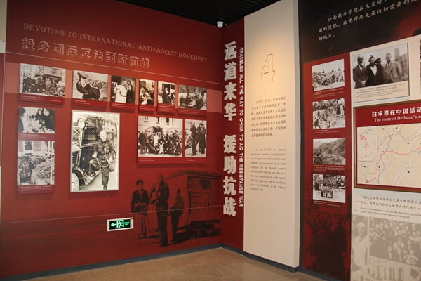 白求恩紀念館展出基本陳列是《偉大的國際主義戰士——白求恩大夫》,展出內容分為七個單元:1.童年、少年、青年時代。2.倡導醫療制度社會化。3.投身國際反法西斯前線。4.遠道來華、援助抗戰。5.戰斗在晉察冀。6.永恒的豐碑。7.精神不朽,友誼長存。白求恩大夫在艱苦的戰爭環境里,同晉察冀邊區軍民同甘苦,共患難,他以崇高的國際主義精神和真正共產主義者的態度,把自己的一切奉獻給了人類最壯麗的事業。毛澤東主席親筆撰寫文章《紀念白求恩》,號召大家學習白求恩精神。