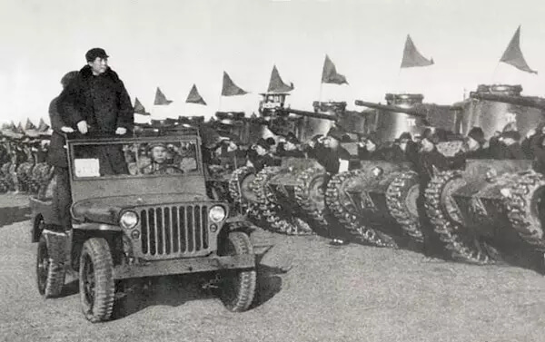 接著,毛主席、朱德總司令等中央領導同志乘吉普車檢閱了人民解放軍部隊。
